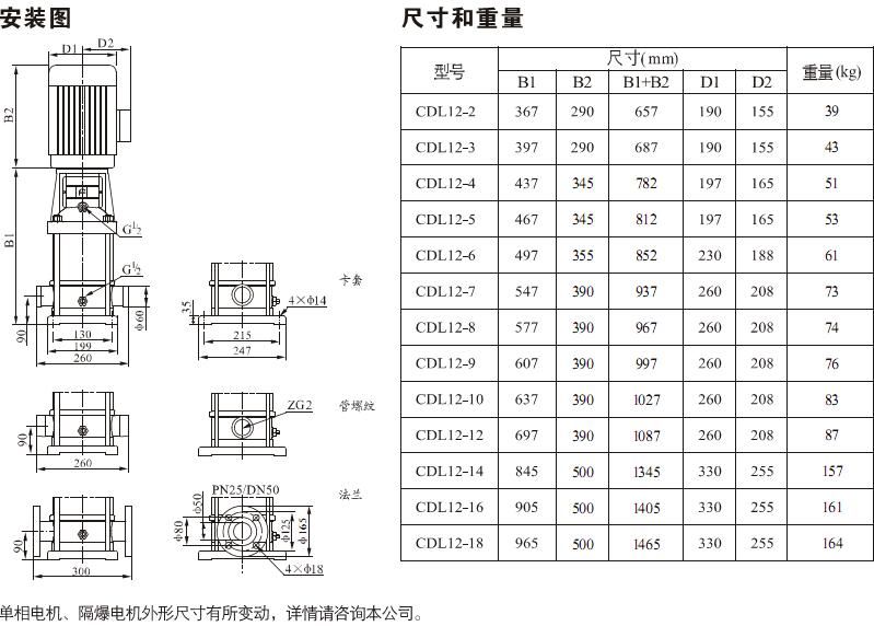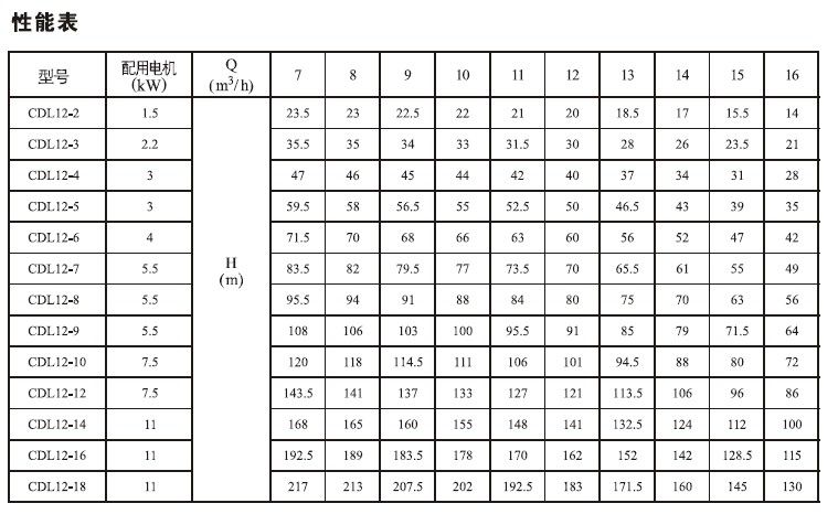 產品介紹 CDL/CDLF12-14FSWSC不銹鋼輕型立式多級離心泵是一種多功能產品,可以輸送從自來水到工業液體的各種不同介質,適應于不同溫度、流量和壓力范圍,CDL適用于無腐蝕性液體,CDLF適用于輕度腐蝕性液體。 水:水廠過濾與輸送、水廠分區送水、主管增壓、高層建筑增壓。 工業增壓:流程水系統、清洗系統、高壓沖洗系統、消防系統。 工業液體輸送:冷卻和空調系統、鍋爐給水和冷凝系統、機床配套、酸和堿。 水處理:超濾系統、反滲透系統、蒸餾系統、分離器、游泳池。 灌溉:農田灌溉、噴灌、滴灌。 運行條件 稀薄、干凈、非易燃易爆并不含固體顆粒或纖維的液體。 液體溫度:常溫型 -15℃至+70℃ 熱水型 -15℃至+120℃ 環境溫度:最高+40℃ 海拔:最高1000m CDL/CDLF12-14FSWSC不銹鋼輕型立式多級離心泵為安裝標準電機的非自吸式多級離心泵,電機軸通過泵頭用軸聯器直接與泵軸連接,拉桿螺栓將耐壓筒、過流部件固定在泵頭和進出水段之間,泵進出水口在泵底同一直線上;本泵可根據需要配置智能保護器,對泵干轉、缺相、過載等進行有效保護。 電機 電機為全封閉,風冷式二極標準電機。 防護等級:IP55 絕緣等級:F 標準電壓, 50Hz ![]() ![]() ![]() 因產品生產批次、型號不同,產品圖片及安裝尺寸僅供參考,詳情可聯系我們的銷售人員了解更多CDL/CDLF12-14FSWSC不銹鋼輕型立式多級離心泵相關信息!