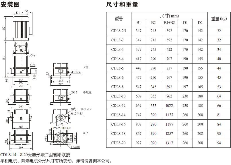 產品介紹 CDL/CDLF8-8FSWSC不銹鋼鍋爐給水增壓泵是一種多功能產品,可以輸送從自來水到工業液體的各種不同介質,適應于不同溫度、流量和壓力范圍,CDL適用于無腐蝕性液體,CDLF適用于輕度腐蝕性液體。 水:水廠過濾與輸送、水廠分區送水、主管增壓、高層建筑增壓。 工業增壓:流程水系統、清洗系統、高壓沖洗系統、消防系統。 工業液體輸送:冷卻和空調系統、鍋爐給水和冷凝系統、機床配套、酸和堿。 水處理:超濾系統、反滲透系統、蒸餾系統、分離器、游泳池。 灌溉:農田灌溉、噴灌、滴灌。 運行條件 稀薄、干凈、非易燃易爆并不含固體顆粒或纖維的液體。 液體溫度:常溫型 -15℃至+70℃ 熱水型 -15℃至+120℃ 環境溫度:最高+40℃ 海拔:最高1000m CDL/CDLF8-8FSWSC不銹鋼鍋爐給水增壓泵為安裝標準電機的非自吸式多級離心泵,電機軸通過泵頭用軸聯器直接與泵軸連接,拉桿螺栓將耐壓筒、過流部件固定在泵頭和進出水段之間,泵進出水口在泵底同一直線上;本泵可根據需要配置智能保護器,對泵干轉、缺相、過載等進行有效保護。 電機 電機為全封閉,風冷式二極標準電機。 防護等級:IP55 絕緣等級:F 標準電壓, 50Hz ![]() ![]() ![]() 因產品生產批次、型號不同,產品圖片及安裝尺寸僅供參考,詳情可聯系我們的銷售人員了解更多CDL/CDLF8-8FSWSC不銹鋼鍋爐給水增壓泵相關信息!