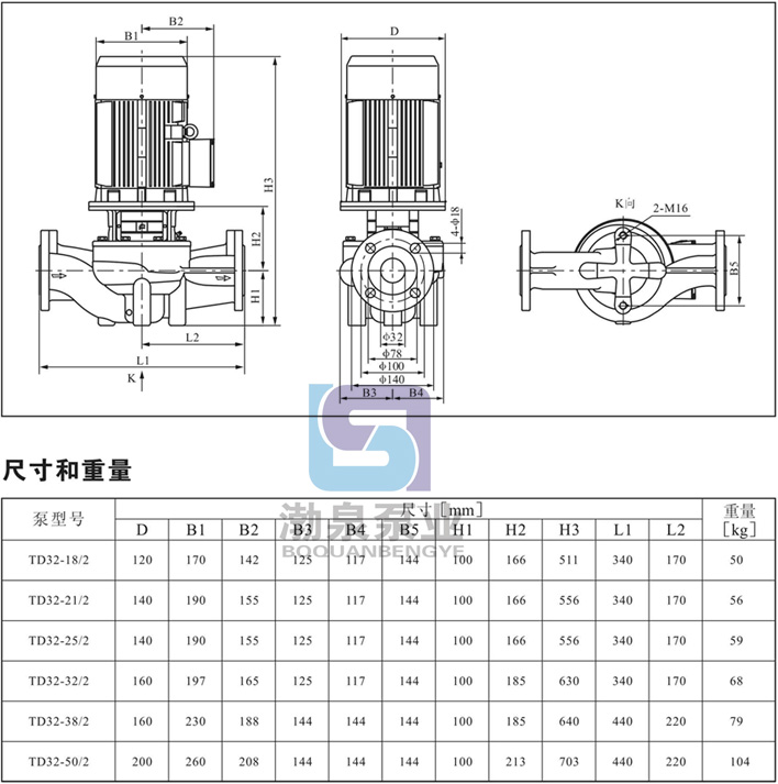 產品介紹 TD32-18/2SWSC TD系列管道循環泵采用電機與泵可分離式結構,泵部分設計為可拉出形式。所有的該類產品都配有標準電機和機械密封。電機為全封閉、風冷式標準電機。其主要尺寸符合JB/T8680標準。 產品泵體相當于一段管路。在泵進行維修時,可以用盲法蘭將泵體封堵,從而不影響系統的正常運行。 產品的聯接法蘭尺寸符合GB/T17241.6或IS07005-2/DIN2501標準中PN16時的有關規定。 產品的進出口直徑符合有關標準尺寸。 產品的泵頭是聯接電機和泵的裝置。其與泵體之間的密封件采用“〇”形圈。 應用 產品適宜在清潔、稀薄、非侵蝕、非易爆易燃,且不含有任何可能對泵造成機械或化學損害的固體顆粒和纖維的液體中使用。具體對液體要求及應用如下;而在液體粘稠或密度較大情況下使用時會造成泵特性曲線的下降和能耗的增加。 液體溫度:-15℃~110℃ 系統最高壓力:常規型為PN12巴;特殊型為PN16巴。 TD32-18/2SWSC TD系列管道循環泵產品在用于輸送水時,其可以用于生活用水、工業用水、冷卻系統用水和區域供熱系統的冷、熱用水。TD產品可以在以下位置使用: ·主循環泵 ·混合環路中的泵 ·鍋爐混流泵 ·燃氣冷凍機泵 ·部分流量過濾器泵 ·定壓系統用泵 ·生活熱水循環 TD32-18/2SWSC TD系列管道循環泵產品用于工業方面。如在化工、制藥、食品加工等行業。可以用于: ·原料的輸送 ·系統增壓 ·混合環路循環泵 ![]() ![]() 安裝條件 TD32-18/2SWSC TD系列管道循環泵有不同的安裝要求,具體的安裝要求如下: ·系統管路具有支撐泵的能力,2.2kw以下(包括2.2kw)電機的泵可以直接懸置于管道中 ;系統管路不具有支撐泵的能力或泵電機功率大于2.2kw時,泵必須安裝在支架或底板上。 ·對于配套2.2kw以下(包括2.2kw)電機的泵可以安裝在水平或垂直于管道的位置上;對于2.2kw以上電機的泵只能安裝在垂直于管道的位置上。 ·泵的安裝,要保證泵在使用時系統管路的張力不應傳遞到泵體上。 ·為了保證電機的正常運轉,泵要安裝在保證有足夠冷卻的環境條件下,且冷卻空氣的溫度不能超過40℃。 ·如果泵安裝在戶外,必須配置合適的外罩以防止電器元件進水或凝霜。 ·為了方便對泵的檢查和維修,在泵的上、下方必須留有足夠的空間。泵電機小于5.5kw時最小留300mm;泵電機大于5.5kw(包括5.5kw)時最小留1000mm。 ·為了防止噪音和振動,保證獲得最佳運行效果,泵在安裝時要采用減振底座。一般采用水泥底座,底座的重量應該是大于或等于1.5×泵重量。 ·為滿足客戶的不同需要,產品分為帶底板和不帶底板兩種。 因產品生產批次、型號不同,產品圖片及安裝尺寸僅供參考,詳情可聯系我們的銷售人員了解更多TD32-18/2SWSC TD系列管道循環泵相關信息!