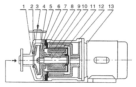 主要材料及用途 磁力泵結構緊湊、外形美觀、體積小、噪音低、運行可靠、使用維修方便。可廣泛應用于化工、制藥、石油、電鍍、食品、電影照相洗印、科研機構、國防工業等單位抽送酸、堿液、油類,稀有貴重液、毒液、揮發性液體,以及循環水設備配套、過濾機配套。特別是易漏、易燃、易爆液體的抽送,選用此泵則更為理想。 磁力泵材質種類 1)工程塑料泵(增強聚丙烯)型號有:8CQ—2、10CQ—3、14CQ—5、16CQ—8、20CQ—12、32CQ—15、40CQ—20、50CQ—25、50CQ—32、65CQ—32。 磁力泵結構示意圖