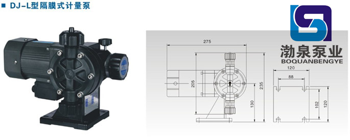 DJL120/0.5耐腐蝕計量泵是由電機驅動的機械隔膜計量泵,適用于底壓力場合的流體精確計量,有多種材質泵頭可選,膜片統一采用多層復合PTFE材質。因其具有很高的計量精度和穩定性能及極高的使用工求,而廣泛應用于污水處理,食品劑添加,各種特殊介質的輸送。