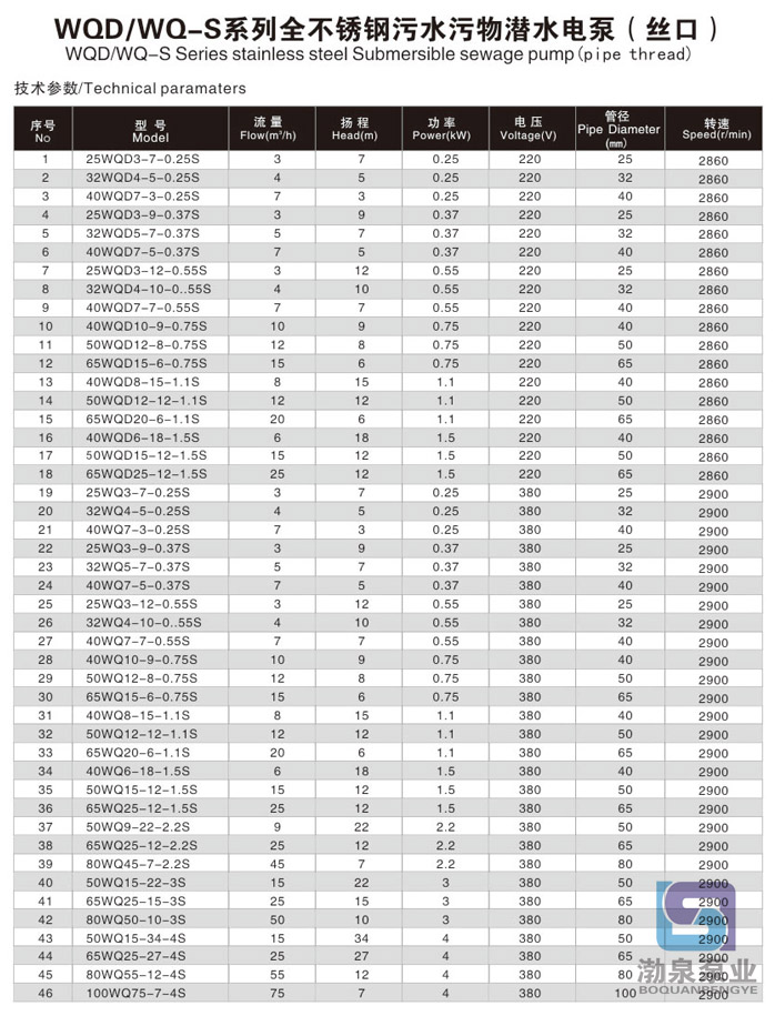 產品介紹 產品概述: 1、WQ75-7-4S 非標大流量不銹鋼排污泵采用獨特的單、雙流道式葉輪結構,大大提高了污物的通過能力,根據產品型號能通 過 泵口徑 5倍的纖維與直徑約為泵出口口徑50%的固體顆粒。 2、采用氟橡膠雙端面機封,氟橡膠徑向O型圈密封,有效地對環境惡劣的液體進行密封保護作用。 3、采用精密鑄造泵殼,重量輕、耐腐蝕、節能型、外形美觀、檢修方便,無需建泵房,潛入水中即可工作,減少工程造價。 4、排污泵內安裝過熱與電流保護器,防止電機過載發熱。 5、可根據客戶特殊要求定制防腐蝕電纜線、四氟機封,及高溫液體的零件配置。 使用條件: 1、以葉輪中心為準,潛入水下深度不得超過5m。 2、輸送介質溫度不高于60℃。 3、輸送介質的PH值304(4-10),316(2-13). 產品用途: 不銹鋼排污泵適用于建筑樓宇、醫院、住宅小區、市政工程、道路交通及施工、工廠排污、養殖、藥業、飲料、海水鹽水、一般腐蝕性介質中含有的固體顆粒、長纖維廢水、污水。 產品優勢: WQ75-7-4S 非標大流量不銹鋼排污泵采用獨特的單雙流道式葉輪結構,氟橡膠雙端面機封、氟橡膠O型圈密封,不銹鋼焊接轉子軸,以及不銹鋼精密鑄造外殼。其中,國標法蘭系列采用雙端面、單端面雙套機封密封。該產品能有效地在惡劣的液體環境下工作,具有耐腐蝕、耐高溫等特點。特別適用于化糞池、化工液體、海水排澇等場合。 ![]() 因產品生產批次、型號不同,產品圖片及安裝尺寸僅供參考,詳情可聯系我們的銷售人員了解更多WQ75-7-4S 非標大流量不銹鋼排污泵相關信息!