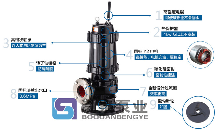 產品介紹 150WQ160-12-11 大功率高揚程排污泵是在引進國外現先進技術的基礎上,結合國內水泵的使用特點而研制成功的新一代泵類產品,具有節能效果顯著、防纏繞、無堵塞、自動安裝和自動控制等特點。在排送固體顆粒和長纖維垃圾方便,具有獨特效果。該系列排污泵采用獨特葉輪結構和新型機械密封,能有效地輸送含有固體物和長纖維。葉輪與傳統葉輪相比,該泵葉輪采用單流道或雙流道形式,它類似于一截面大小相同的彎管,具有非常好的過流性,配以合理的蝸室,使得該泵具有效果高、葉輪經動靜平衡試驗,使泵在運行中無振動。 該泵水力性能先進、成熟,產品經測試各項性能指標均達到有關標準規定,產品投放市場后以其獨特的功效,可靠的性能,穩定的質量受到廣大用戶的歡迎和好評。 應用范圍 1.市政工程、建筑工地; 2.住宅區的污水排放; 3.醫院、賓館等的污水排放; 4.城市污水處理廠排水系統; 5.人防系統排水站,自來水廠的給水裝置; 6.工廠、商業嚴重污染污水的排放。 150WQ160-12-11 大功率高揚程排污泵產品特點 1.采用大流道抗堵塞水力部件設計,大大提高污物通過能力,能有效地通過水泵口徑的5倍纖維物質和直徑為泵口徑約30%的固體顆粒。 2.設計合理,配套電機合理,效率高,節能效果顯著。 3.機械密封采用雙道串聯密封,材質為硬質耐腐碳化鎢,具有耐用、耐磨等特點,可以使泵安全連續運行8000小時以上。 4.泵結構緊湊,體積小,移動方便,安裝簡便,無需建泵房,潛入水中即可工作,大大減少工程造價。 5.泵油室內設有油水探頭,當水泵側機械密封損壞后,水進入油室,探頭發生信號,對泵實施保護。 6.可根據用戶需要配合全自動安全保護控制柜,對泵的漏水、漏電、過載及超溫等進行監控,保證泵運行可靠安全。 7.雙導軌自動耦合安裝系統,給泵的安裝、維修帶來了極大的方便,人可不必為此而進出污水坑。 8.浮球開關可根據所需的水位變化,自動控制泵的停啟,無需專人看管。 9.在使用揚程范圍內保證電機運行不過載。 10.根據使用場合電機可采用水套式外循環冷卻系統,能保證水泵在無水(干式)狀態下安全運行。 11.安裝方式有固定式自動耦合安裝和移動式自由安裝二種,可滿足不同的使用場合。 型號意義 50WQ25-32-5.5 50-泵排出口公稱直徑(mm) QW-潛水排污泵 25-額定流量(m3/h) 32-額定揚程(m) 5.5-配用電機額定功率(kW) ![]() 主要性能參數