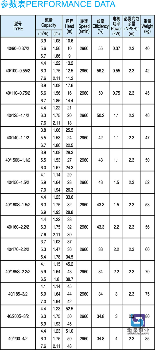 產品介紹 KQL40/170-2.2/2 立式冷卻循環泵供輸送不含固體顆粒的清水及物理化學性質類似于水的液體之用。同時根據使用溫度、介質等不同在ISG型管道離心泵基礎上派出適用熱水、高溫、腐蝕性化工泵、油泵。該產品具有同效節能、噪音低、性能穩定等特點。 用途: KQL40/170-2.2/2 立式冷卻循環泵用于空調、采暖、衛生用水、水處理冷卻冷凍系統、液體循環和供水、增壓及灌溉等領域中無腐蝕的冷水和熱水輸送。 工作條件: 轉速:2960r/min,1480r/min或980r/min 流量范圍:1.8~2000m3/h 揚程:≤127m 介質溫度:-10℃~120℃ 環境溫度:最大+40℃;海拔高度小于1000m;相對濕度不超過95% 材質: 泵殼、泵蓋、葉輪:鑄鐵 泵軸:45#鋼鍍鉻或不銹鋼(2Cr13) 機械密封動、靜環:浸銻石墨、碳化硅 結構:結構緊湊的單級泵,適用于現代建筑物。 產品特點: KQL40/170-2.2/2 立式冷卻循環泵結構緊湊、合理,泵與電機直接連接,外形美觀,占地面積小效率高,閉式鑄鐵葉輪,葉輪懸臂短,機泵軸完全同心,泵運行平穩、可靠,噪音低壽命長,強制環流沖洗機械密封,免保養、無滲漏。 管道泵選型指南: 例如:KQL80/160-7.5/2 或KQW80/160-7.5 KQL標準立式單級離心泵,KQW標準臥式單級離心泵 80進出口直徑 160葉輪名義直徑 7.5/2電機功率/電機極數 ![]() ![]() 因產品生產批次、型號不同,產品圖片及安裝尺寸僅供參考,詳情可聯系我們的銷售人員了解更多KQL40/170-2.2/2 立式冷卻循環泵相關信息!