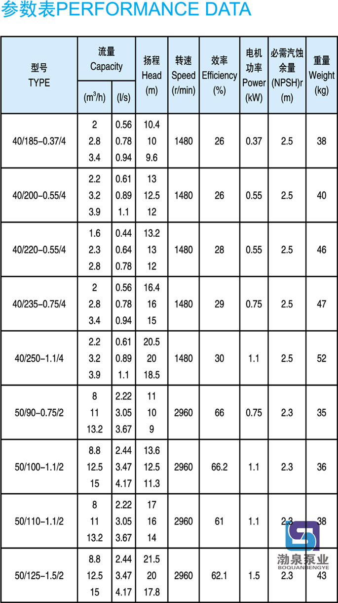產品介紹 KQL50/100-1.1/2 立式管道循環泵供輸送不含固體顆粒的清水及物理化學性質類似于水的液體之用。同時根據使用溫度、介質等不同在ISG型管道離心泵基礎上派出適用熱水、高溫、腐蝕性化工泵、油泵。該產品具有同效節能、噪音低、性能穩定等特點。 用途: KQL50/100-1.1/2 立式管道循環泵用于空調、采暖、衛生用水、水處理冷卻冷凍系統、液體循環和供水、增壓及灌溉等領域中無腐蝕的冷水和熱水輸送。 工作條件: 轉速:2960r/min,1480r/min或980r/min 流量范圍:1.8~2000m3/h 揚程:≤127m 介質溫度:-10℃~120℃ 環境溫度:最大+40℃;海拔高度小于1000m;相對濕度不超過95% 材質: 泵殼、泵蓋、葉輪:鑄鐵 泵軸:45#鋼鍍鉻或不銹鋼(2Cr13) 機械密封動、靜環:浸銻石墨、碳化硅 結構:結構緊湊的單級泵,適用于現代建筑物的。 產品特點: KQL50/100-1.1/2 立式管道循環泵結構緊湊、合理,泵與電機直接連接,外形美觀,占地面積小效率高,閉式鑄鐵葉輪,葉輪懸臂短,機泵軸完全同心,泵運行平穩、可靠,噪音低壽命長,強制環流沖洗機械密封,免保養、無滲漏。 管道泵選型指南: 例如:KQL80/160-7.5/2 或KQW80/160-7.5 KQL標準立式單級離心泵,KQW標準臥式單級離心泵 80進出口直徑 160葉輪名義直徑 7.5/2電機功率/電機極數 ![]() ![]() 因產品生產批次、型號不同,產品圖片及安裝尺寸僅供參考,詳情可聯系我們的銷售人員了解更多KQL50/100-1.1/2 立式管道循環泵相關信息!