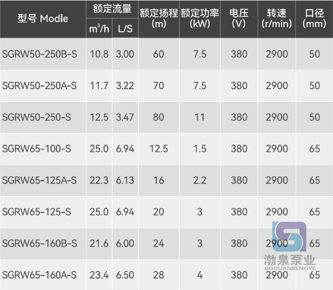 產品介紹 主要用途 SGRW50-250A-S不銹鋼臥式管道離心泵可供輸送清水及物理化學性質類似于清水的其他液體之用,適用于工業和城市給排水、高層建筑增壓送水、園林噴灌、消防增壓、遠距離輸送、暖通制冷等冷熱水循環增壓及設備配套、能源、治金、化工、紡織、造紙以及賓館、飯店等鍋爐熱水增壓輸送及城市采暖系統循環用泵,使用介質溫度T≤103℃。 產品特點 1、泵結構緊湊、體積小、外形美觀。 2、進出口徑相同,安裝方便,無需改變管路,可像閥門一樣直接安裝在管路任何部位。 3、機泵同軸,簡化了中間結構,增加了運行的平穩性,葉輪具有很好的動靜平衡,運行時震動小、噪音低,延長了軸承的使用壽命,改善了使用環境。 4、電機采用高效散熱鑄鋁機殼、進口軸承、不銹鋼316焊接轉子軸、氟橡膠“O”形圈、氟橡膠機械密封,過流部件全部采用不銹鋼精密鑄造。 5、維修方便、無須拆卸管道,只要拆下連接架,取出電機及傳動組件即可進行檢修維護。 6、其結構,精心設計,不僅縮小了泵房面積,改善了空間,而且大大節省基建投資。 7、可定制防爆電機,可定制四氟機封。 使用條件 1、適用介質:固體不溶物體積含量不超過單位體積的0.1%,粒度不大于0.2mm。(介質如帶有細小顆粒須采用耐磨式機械密封,請在訂貨時說明。) 2、周圍環境溫度不超過40℃,相對濕度不超過95%,海拔高度不超過1000m; 3、輸送介質的PH值304(4-10)、316(2-13); 4、輸送介質的密度≤1.05×103kg/m3; 5、使用電壓220V/380V,頻率50Hz,電壓波動不超過額定值的±10%。 型號說明 ![]() ![]() 因產品生產批次、型號不同,產品圖片及安裝尺寸僅供參考,詳情可聯系我們的銷售人員了解更多SGRW50-250A-S不銹鋼臥式管道離心泵相關信息!