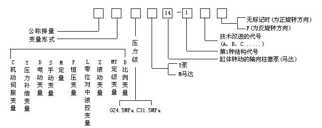 型號說明 示例:63SCY14-1B 表示:排量為63毫升/轉,壓力為31.5MPa的手動變量的缸體旋轉的軸向柱塞油泵。 (即1000r/min時公稱流量為63L/min)