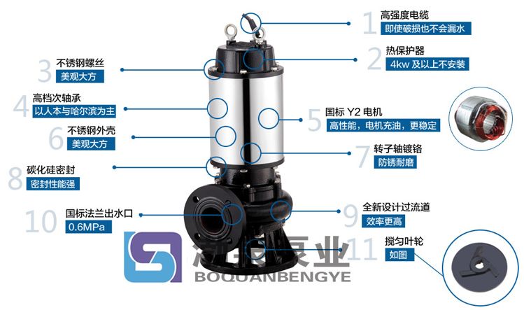 用途 1.工廠、商業嚴重污染廢水的排放。2.城市污水處理廠、醫院、賓館的排水系統。 3.住宅區的污水排水站。4.人防系統排水站、自來水廠的給水裝置。 5.市政工程、建筑工地。6.勘探、礦山、發電廠配套附機。7.農村沼氣池、農田灌溉、河塘清淤。 原理: 圓盤形蝶板繞著軸線旋轉,自動攪勻排污泵的蝶板裝置于管道的直徑方向。蝶閥閥體圓柱形通道內。旋轉角度為0°~90°之間,旋轉到90°時,閥門則牌全開狀態。 ![]() 特點 1、利用泵自身出水壓力,攪勻污水池內沉淀污泥,真正達到徹底排出污水池沉淀物的目的。 2、大流道抗堵塞水力部件設計,大大提高污物通過能力,能有效通過泵口徑的5倍纖維物質和直徑為泵口徑約50%的固體顆粒。 3、設計合理,配套電機合理,效率高,節能效果顯著。 4、機械密封采用雙道串聯密封,材質為硬質耐腐碳化鎢,耐用,耐磨,可使泵安全連續運行8000小時以上。 5、泵結構緊湊,體積小、移動方便,安裝簡便,無需建泵房,潛入水中即可工作,減少工程造價。 6、油室內設有油水探頭,對泵實施絕對保護。 7、可配備全自動安全保護控制柜,對立申自動攪勻排污泵的漏水、漏電、過載及超溫等進行絕對保護,提高產品的安全可靠性。 8、浮球開關可根據所需的水位變化,自動控制泵的停啟,無需專人看管。 9、電機可采用水套式外循環冷卻系統,保證電泵在無水(干式)狀態下安全運行。 10、雙導軌自動耦合安裝系統,給泵的安裝、維修帶來極大的方便,人可不必為此進入污水坑。 11、安裝方式有固定式自動耦合安裝和移動式自由安裝二種,可滿足不同的使用場合。 使用條件: 1、攪勻潛水排污泵系列產品在額定電壓為380V,電源頻率為50Hz時適用 2、介質溫度不超過40攝氏度,介質密度≤1150kg/m3,PH值在5-9范圍之間; 3、海拔高度不超過1000米; 4、輸送介質年粘度不超1000CP; 5、產品工作運行時必須完全潛入水中,但潛水深度不得超過10m; 6、產品材質主要為鑄鐵,不能用于強腐蝕性或含有強腐蝕性的介質中;
