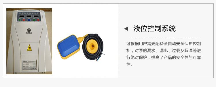 6、泵接線腔內設有漏水檢測探頭,出現漏水時,探頭發出信號,控制系統對泵實施保護。本公司可配全自動保護控制柜。